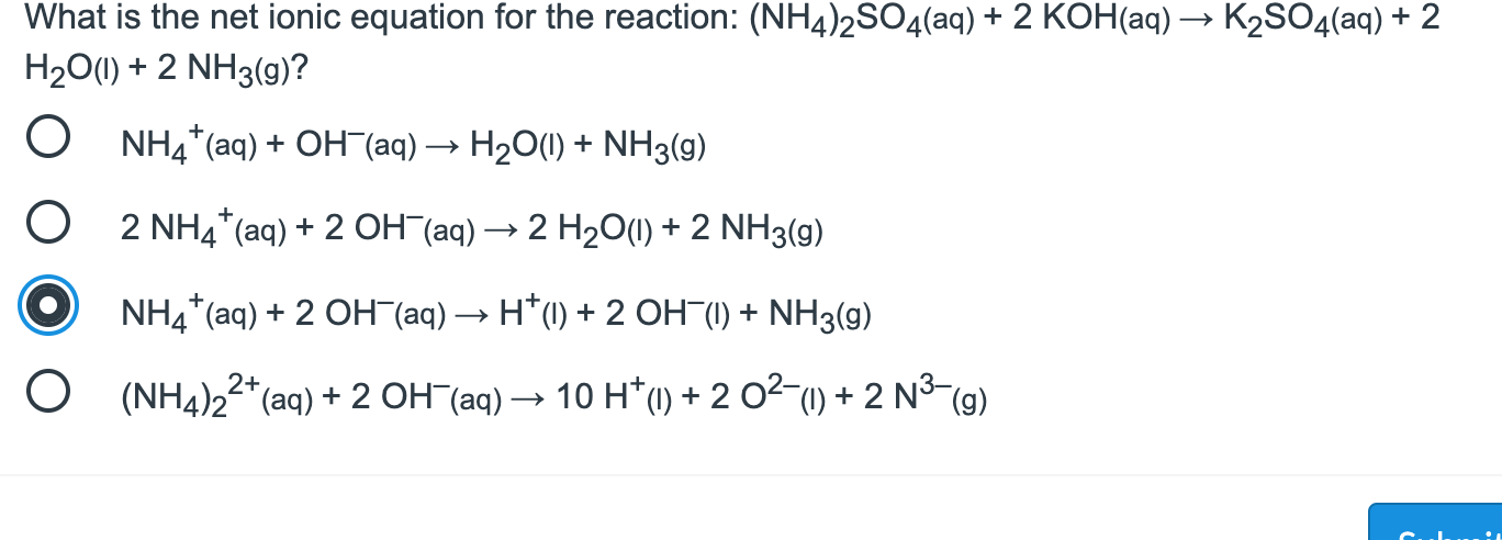 Homework Statement The net ionic equation for the reaction between aqueous solutions of HF and KOH is___. Relationship of pH pOH 14. This is because KOH is not available in very pure formit absorbs water from the air.